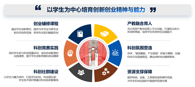 建设思路:中心通过围绕创新创业相关必修课程、辅修专业、课外活动、科创竞赛、学生社团、产教融合、科创文化等育人阵地,打造课程、实践、活动等多维度融合贯通的创新创业育人机制,形成具有学院特色的“全天候”、“体系性”创新创业育人生态。
