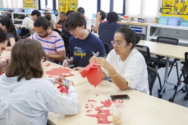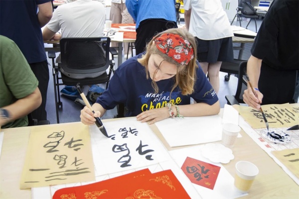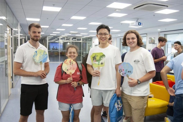 从落地上海的那一刻起,国际生们便开启了对中国的探索。迎新会上,学院精心打造了沉浸式文化体验工坊,非遗漆扇制作、翰墨书法研习、精巧剪纸艺术三大传统文化体验区同时开放。国际学生们纷纷投身其中,亲手制作漆扇、研习书法、剪出精美图案,在实践操作中深刻感受中华文化的独特魅力。